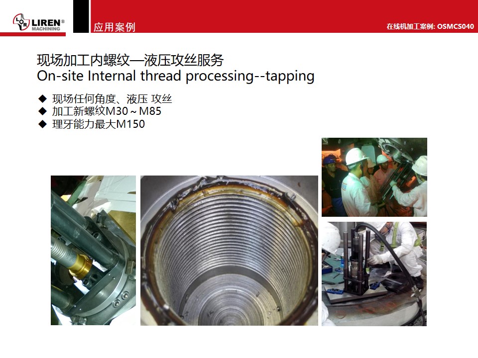 通过十年多的探索和积累,上海利刃已具备了相当的装备规模和加工能力,积累了许多经验技术,成功地向客户提供了两千余次、多种类型的现场机械加工服务,在火电、核电、石油、化工、天然气、冶金、造船、设备制造等领域里,取得了日益广泛的应用。